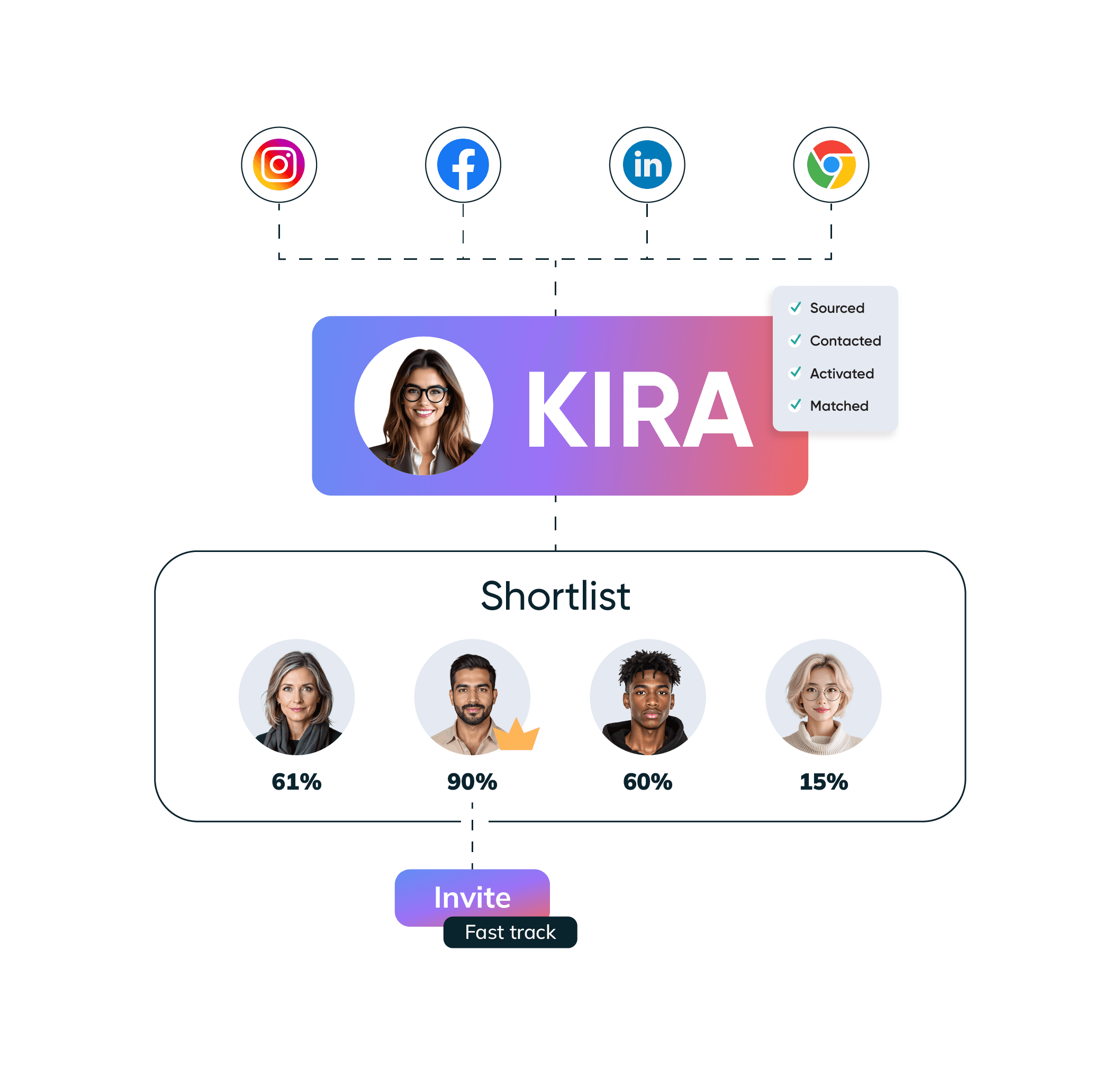 KIRA automatically scans various platforms, social networks, and public profiles to identify top talent that perfectly matches your requirements.